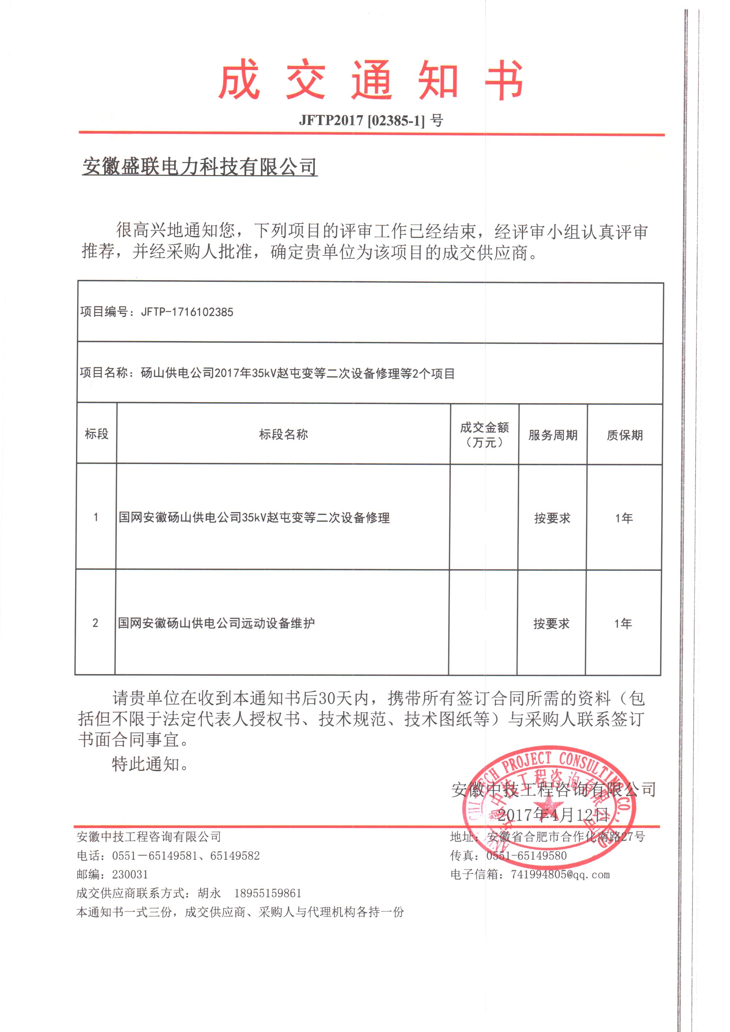 中标通知书——砀山供电公司2017年35KV赵屯变等二次设备维修等2个项目
