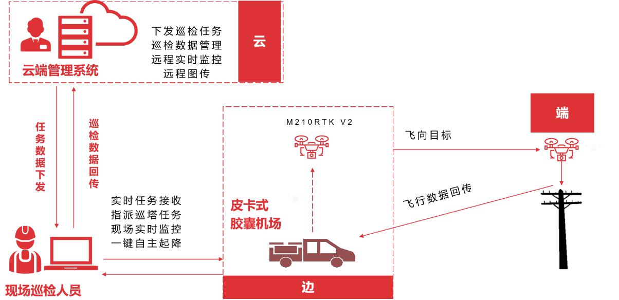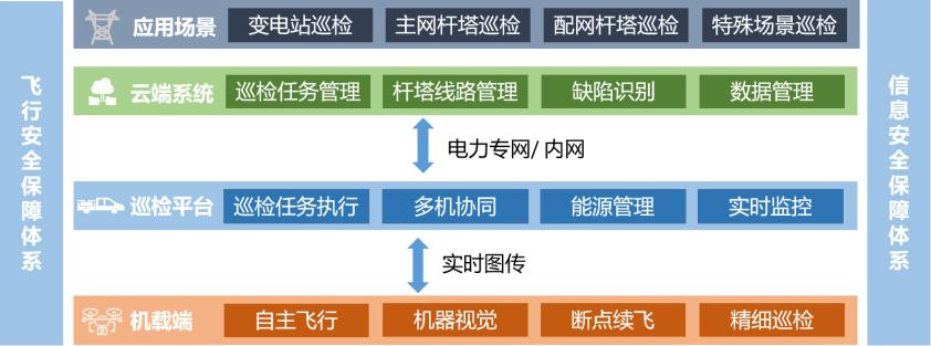【云-边-端】方案架构,有效连接中央管理系统、固定机场和无人机。云端中央管理系统负责任务的统一下发和巡检数据管理及多机场的监控,实现从一到多个变电站的统一管理,扩大智能运检的作业半径。
