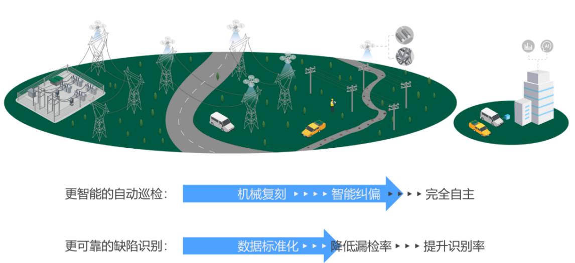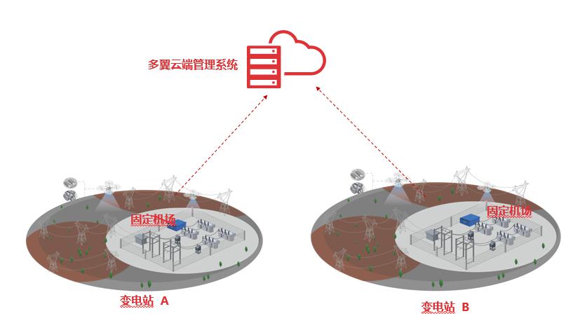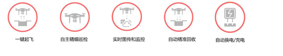 在变电站内部署固定式无人机机场,在云端管理系统下达巡检任务后,无人机自主起降并实现精细化巡检,任务完成后,无人机被机场自动回收,巡检数据传回云端,并借助AI算法快速识别缺陷。
