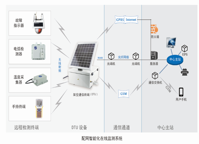 随着国家电网公司坚强智能电网建设的不断推进及居民生活水平的不断提高,对配电网智能化建设,提出了更高的要求,配电智能化在线监测系统应运而生。该系统能实时准确地在线监测线路故障状态、线路负荷电流、电压等信息,并将所采集到的信息发送回主站中心;主站对信息进行数据统计、分析、拓扑计算,确定故障区域,故障点的信息会通过短消息发送到供电局生产管理部门、线路专工、线路维护负责人等设定的相关人员的手机上,从而引导工作人员迅速准确找到故障点。