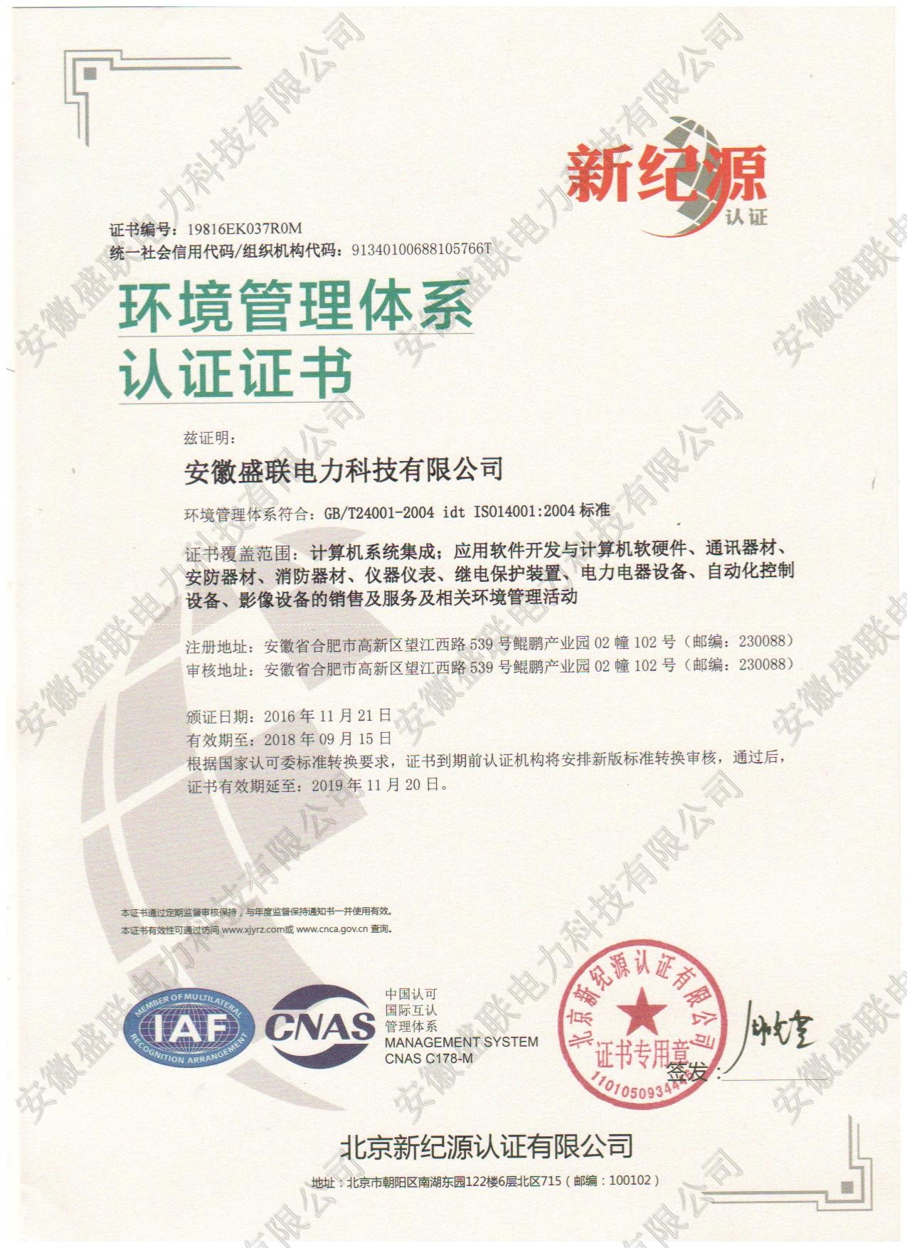 环境管理体系认证证书