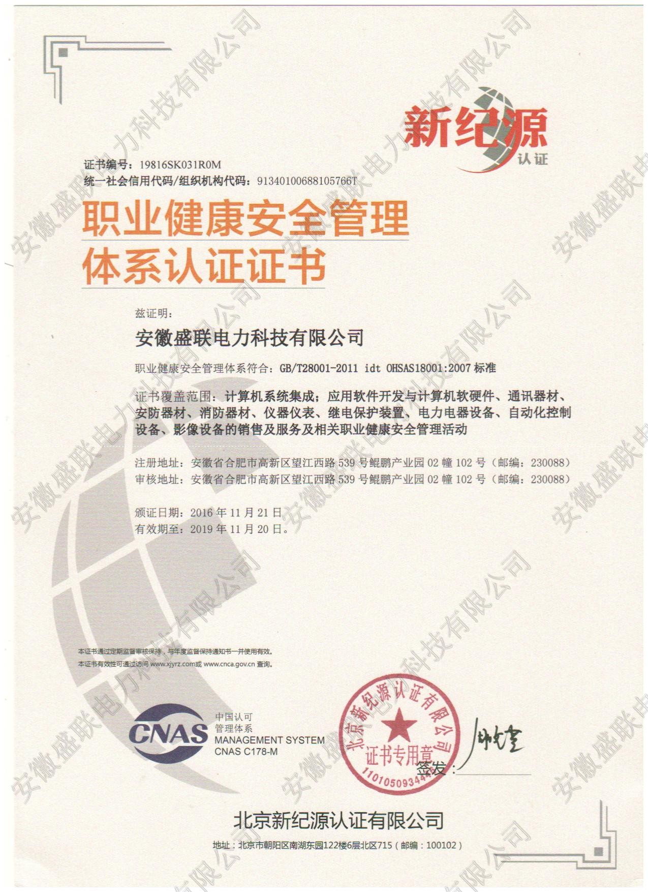 职业健康安全管理体系认证证书