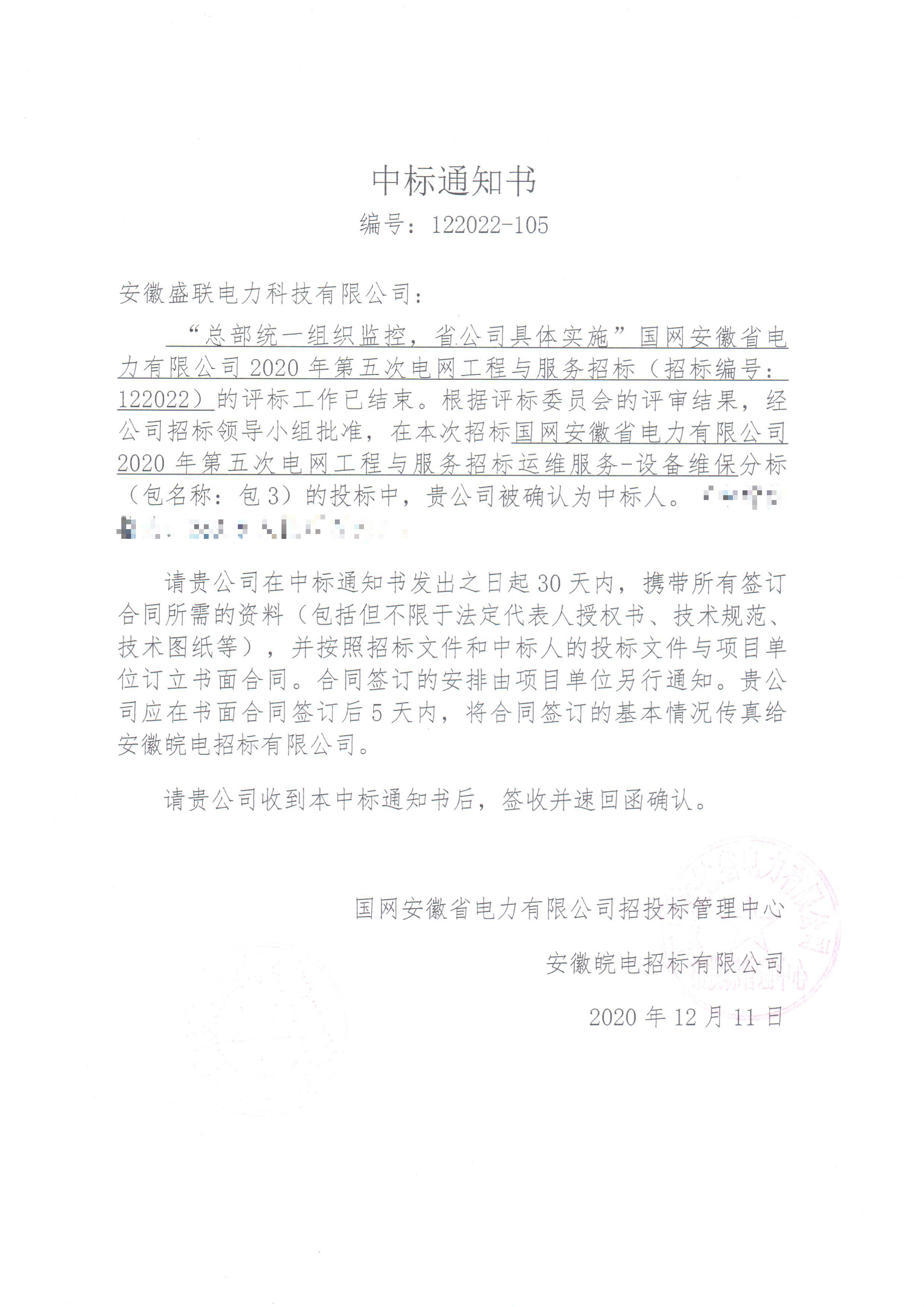 热烈祝贺安徽盛联电力科技有限公司在《 国网安徽省电力有限公司2020年第五次电网工程与服务招标采购 》中标